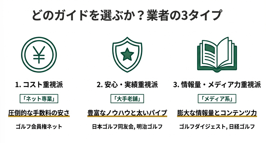 - 手厚いサポートや詳細なゴルフ場情報を求めるなら、明治ゴルフや日本ゴルフ同友会などの大手業者がおすすめ