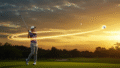夕焼けのゴルフ場で、男性ゴルファーがクラブを振り上げた瞬間、ゴルフボールから光の軌跡がダイナミックな曲線を描いている。