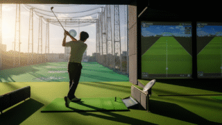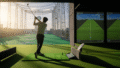 室内ゴルフ練習場で、2人の男性ゴルファーが、それぞれゴルフボールを打つ準備とスイング中の姿勢を見せています。