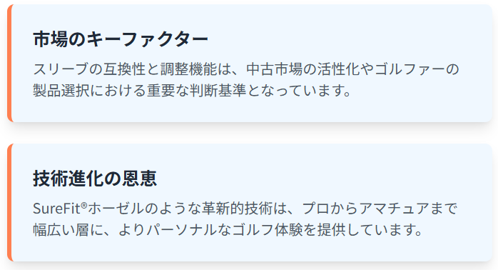 特にドライバーとフェアウェイウッドは共通のSureFit®ホーゼルシステムを採用している期間が長いですが、ユーティリティは専用のスリーブが用意されていることが多く、注意が必要です。常に最新の公式情報を確認することが最も安全です。