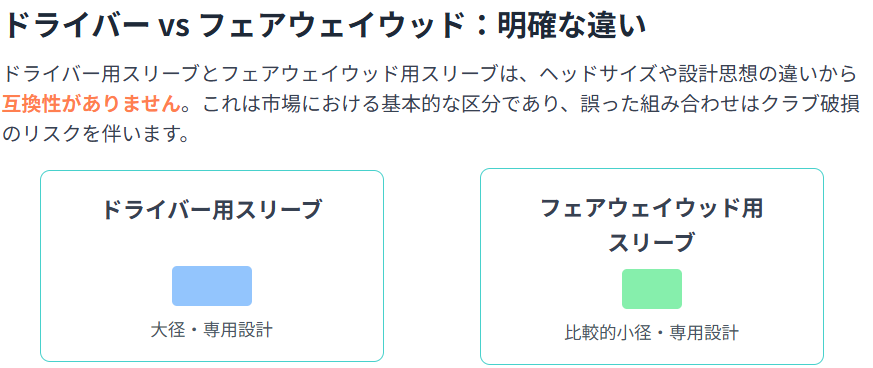 - ドライバー、フェアウェイウッド、ユーティリティ用スリーブの具体的な違いを理解できる