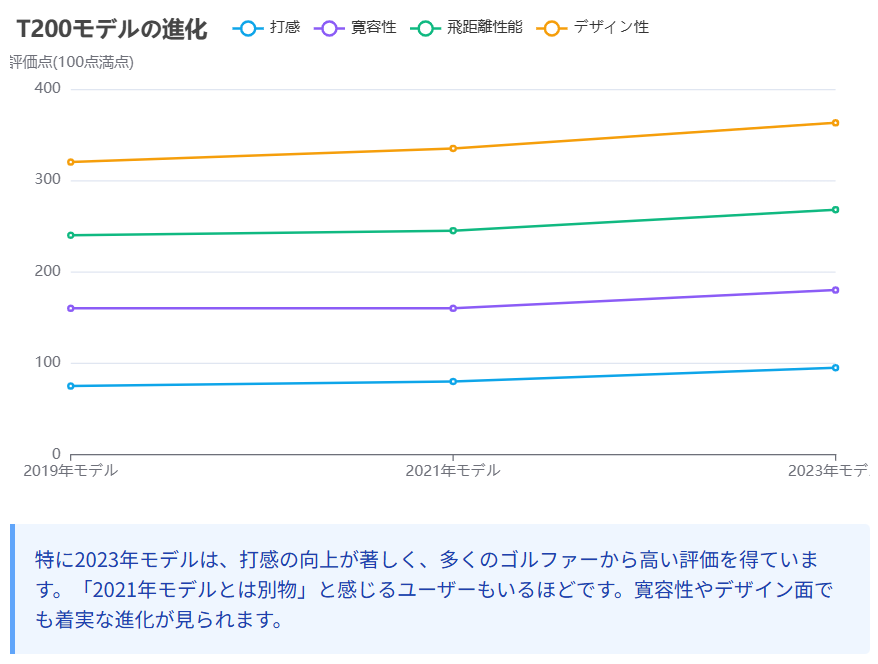 タイトリスト T200 アイアンは、2019年の初代モデル登場以来、2021年、2023年とモデルチェンジを重ねて進化してきました。ここでは、特に2021年モデルと2023年モデルの比較を中心に、その進化のポイントを見ていきましょう。
