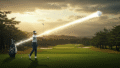 夕焼けのゴルフ場で、ゴルファーがスイングしたボールから光り輝く弧を描く軌跡が空へと伸びています。