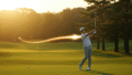夕焼けのゴルフコースに立つゴルファーがゴルフクラブを持ち、そのクラブから白い光の軌跡が上空へ伸び、地面には赤い光の軌跡が弧を描いています。